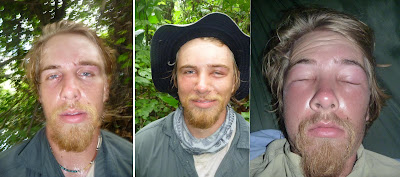 We headed downriver and I tried to climb a comparison nest. By the time we were set up and heavy downpour began. Not knowing how bad it was going to be, we had to call off the attempt and get downstream. We reached Kinlock Camp and ate lunch while Pancho and Vicky loaded up their kayaks. We then headed back downstream and camped above the confluence with the Raspaculo Branch. It was a beautiful evening. Brad began swelling up and by the following morning his eyes were nearly swollen shut.